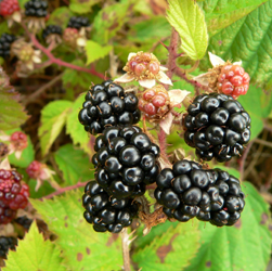 Although not particularly ornamental, bramble berry bushes, when trained on wires, offer a nice summer screen, or they can be grown against a fence or wall. Both raspberries and blackberries require slightly acidic soil, adequate moisture and will need support. Plants will succeed in light shade, but prefer a sunny location. Mulch in early spring with manure or compost, then cut old canes down to the ground after fruiting in early to mid-summer. No more than 5-6 strong stems should grow from each plant. Protect fruit from birds and squirrels to ensure enough left to harvest.